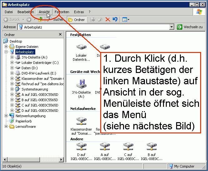 1. Durch Klick (d.h. kurzes Betätigen der linken Maustaste) auf Ansicht in der sog. Menüleiste öffnet sich das Menü |